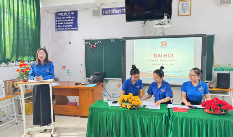 Ngày 07/9/2025, tại Trường Tiểu học Phú Tân, Chi đoàn nhà trường đã long trọng tổ chức Đại hội Chi đoàn nhiệm kỳ 2025–2026. Đại hội diễn ra trong không khí trang nghiêm, đoàn kết, với sự tham dự của đồng chí Nguyễn Lê Thanh Mai - Phó bí thư Đoàn phường Bình Dương, đồng chí Đào Thị Kim Thuý – Phó Bí thư Chi bộ trường Tiểu học Phú Tân cùng toàn thể đoàn viên chi đoàn.