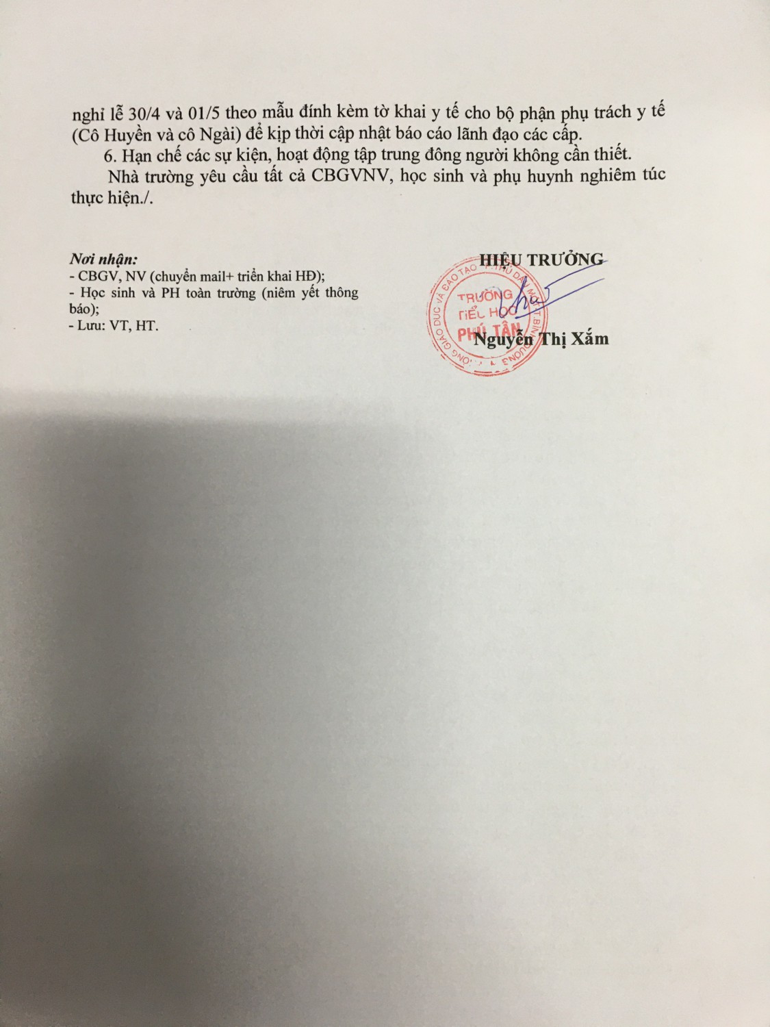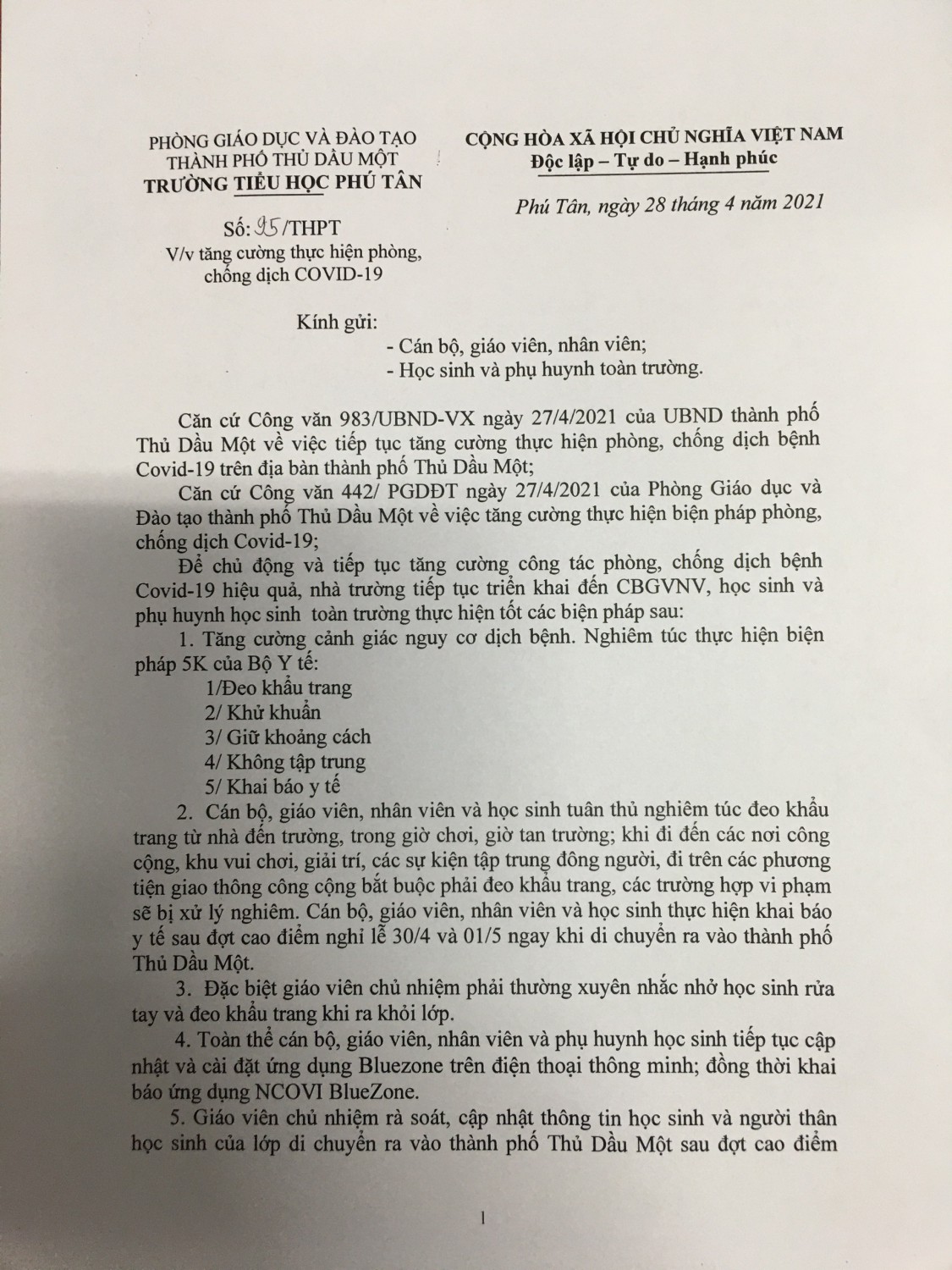 Tập thể cán bộ, giáo viên, nhân viên, học sinh và phụ huynh trường Tiểu học Phú Tân tiếp tục tăng cường thực hiện phòng chống dịch Covid-19.