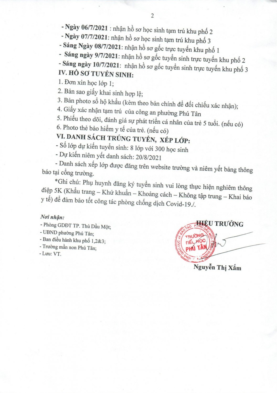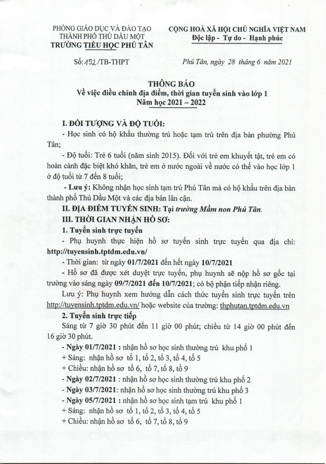 Ngày 27/06/2021, UBND thành phố đã trưng dụng trường Tiểu học Phú Tân làm Khu cách ly y tế tập trung của thành phố Thủ Dầu Một phòng, chống dịch bệnh COVID-19. Để đảm bảo công tác tuyển sinh lớp 1 năm học 2021-2022, nhà trường đổi địa điểm tuyển sinh tại "TRƯỜNG MẦM NON PHÚ TÂN".