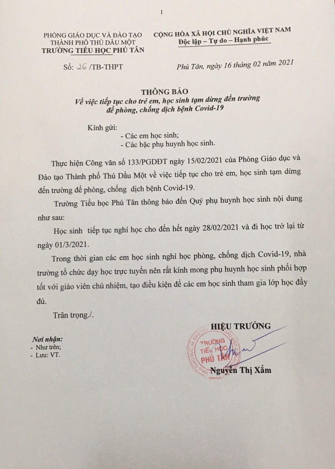 THÔNG BÁO: Về việc tiếp tục cho học sinh tạm dừng đến trường đế phòng, chống dịch bệnh Covid-19
