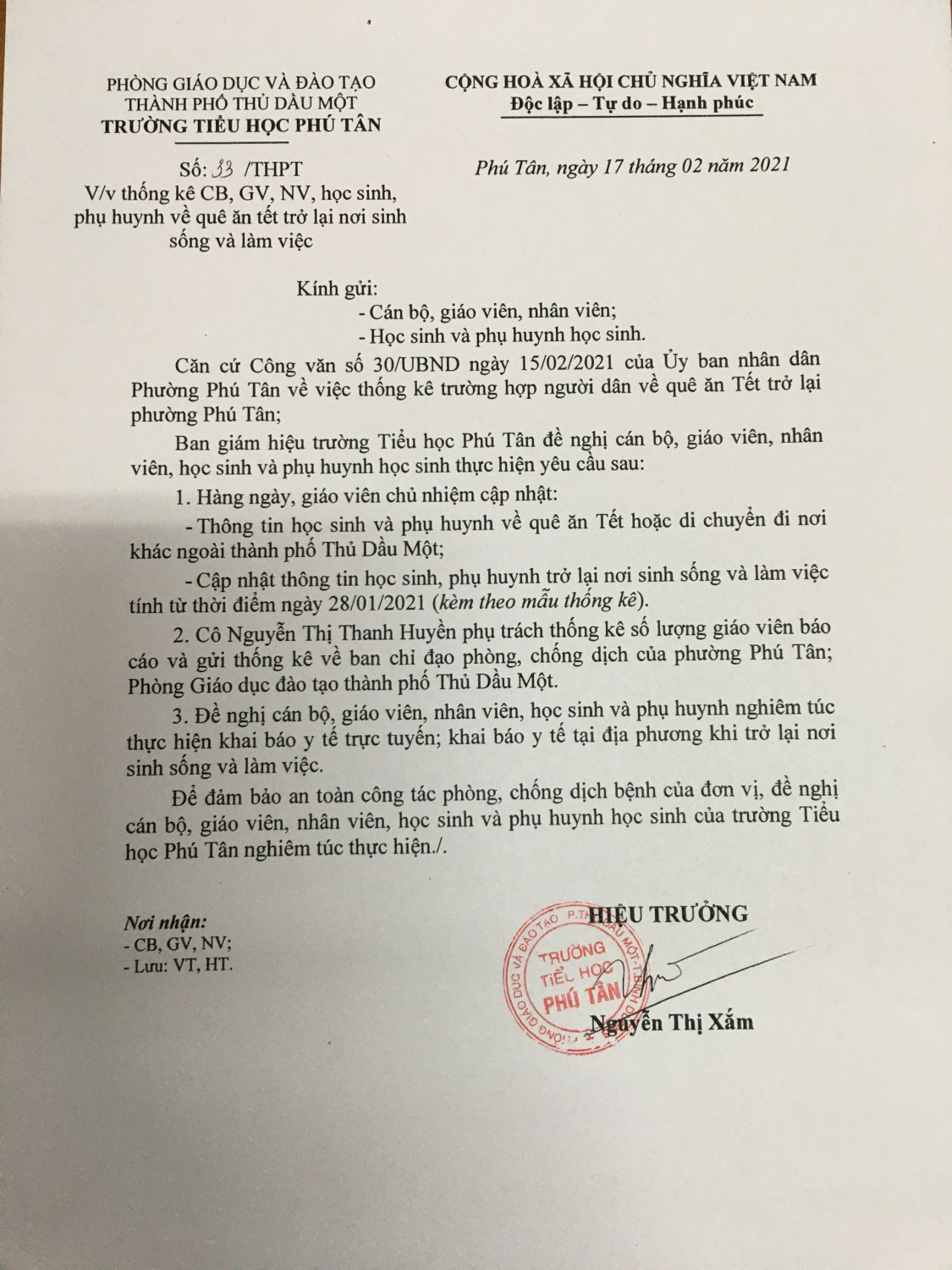 V/v thống kê CB, GV, NV, học sinh, phụ huynh về quê ăn tết trở lại nơi sinh sống và làm việc