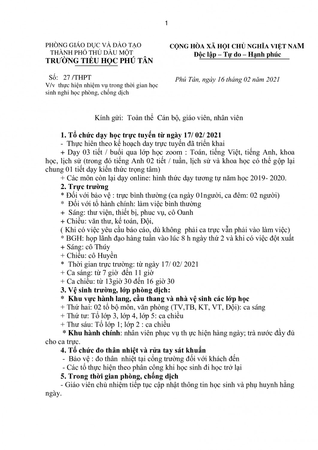 V/v thực hiện nhiệm vụ trong thời gian học sinh nghỉ học phòng, chống dịch
