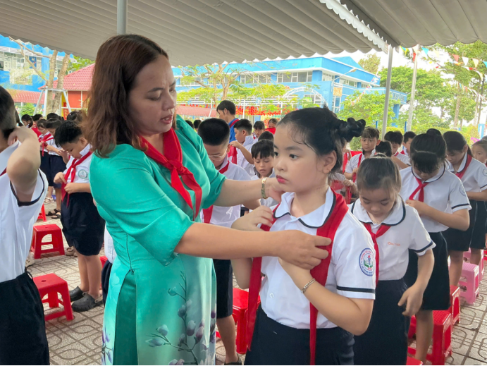 ❤️❤️Giây phút thiêng liêng và xúc động nhất chính là khi hơn 344 em nhi đồng ưu tú được chính tay quý đại biểu, quý thầy cô trao chiếc khăn quàng đỏ thắm trên vai. Kể từ giây phút này, các em đã chính thức trở thành Đội viên Đội TNTP Hồ Chí Minh. Dưới cờ Đội, các em đã đồng thanh hô vang lời hứa của người đội viên, thể hiện quyết tâm phấn đấu rèn luyện để xứng đáng với danh hiệu cao quý.